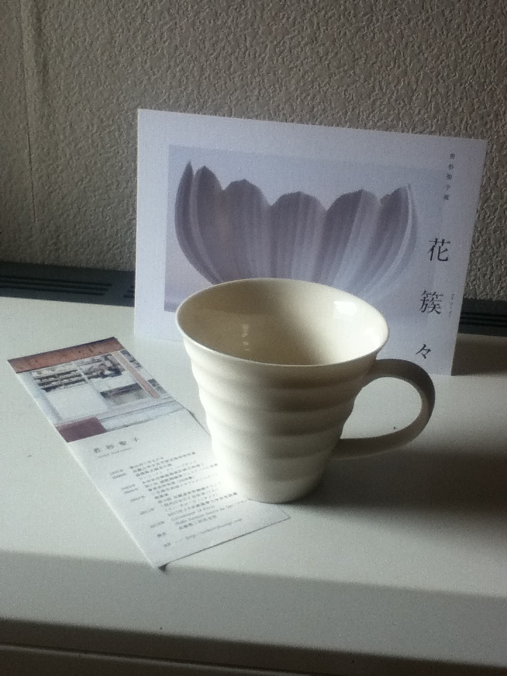 ギャラリーでは作品の販売もありました。花器や茶碗など筒型(と云うか円形と云うか)のものが若杉さんの作品の本領と思いましたが、大好きな作家さんのものなら日常に取り入れたいと思い、マグカップを購入。贈答品などで、花器と湯呑みはうちに売るほどあるので。それ言うとマグカップも沢山あるんだけど、わたしは水分を沢山取る方なので小さな湯のみでサッパサッパと何度も飲むよりはマグカップ使おうと思って。