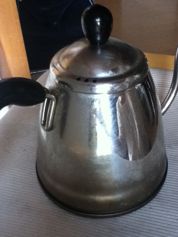 ニットクロスでコーヒーケトルの曇ったのを磨いてみたよ! 結構力は要ったけど、ピカピカになりました。